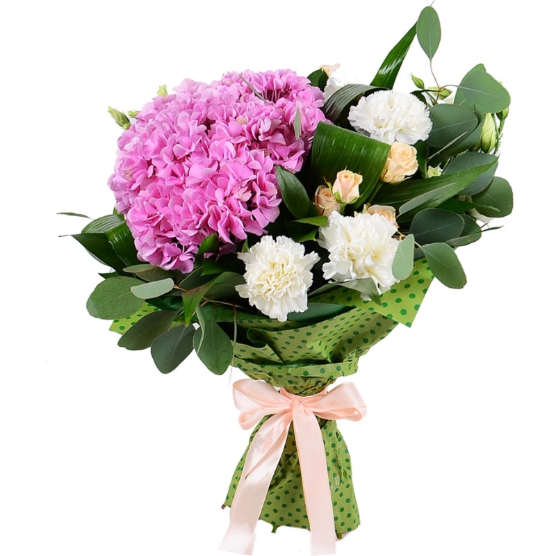 Букет состоит из 1 гортензия розовая, 5 белых гвоздик, 2 кустовых розы, 3 эустомы, эвкалипт, зелень, красивая упаковка, атласная лента.