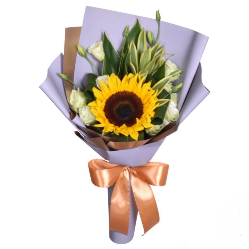 Букет состоит из 1 подсолнух, 4 ветки эустомы, зелень, красивая упаковка, атласная лента.