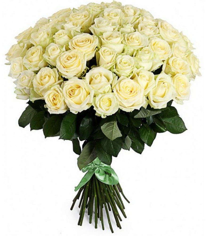 Букет состоит из 51 белая роза, прозрачная упаковка, атласная лента.