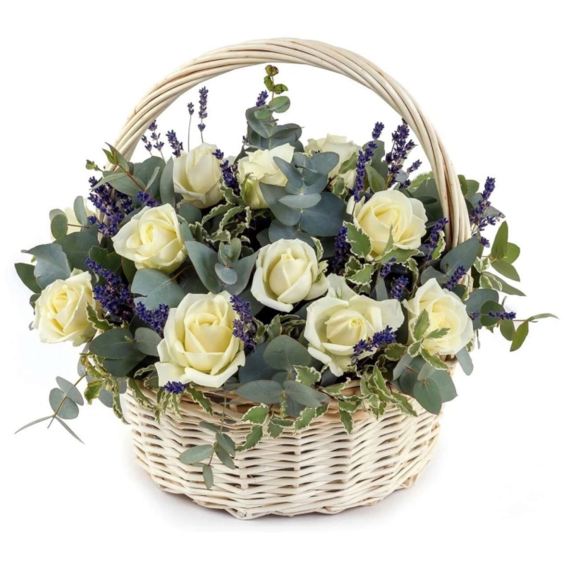 Корзина из белых роз с лавандой