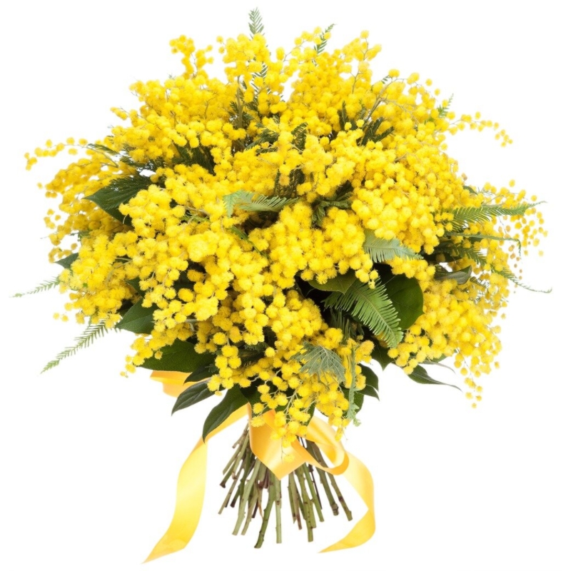 Букет состоит из 21 мимоза, прозрачная упаковка, атласная лента.